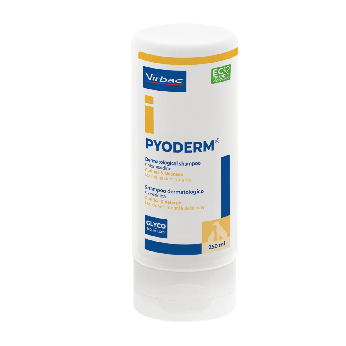 VIRBAC Pyoderm šampon sadrži hlorheksidin diglukonat koji daje svoj doprinos u sprečavanju proliferacije bakterijske i gljivične mikroflore. VIRBAC Pyoderm šampon je moguće koristiti kao pomoć u terapiji piodermije pasa.