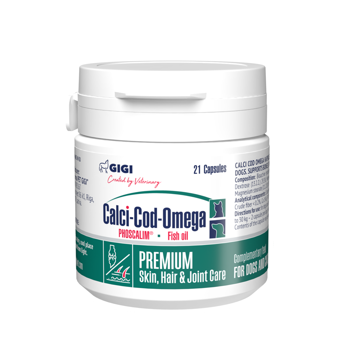 Snaga organizma vašeg ljubimca ne vidi se samo u energiji i kretanju, već i u čvrstini kostiju, stabilnosti hrskavica, kvalitetu kože i prirodnom sjaju dlake. Kada ishrana ne pruža dovoljno podrške, kada je organizam u fazi rasta, oporavka ili zrelijeg doba, upravo su minerali i esencijalne masne kiseline ono što pravi vidljivu razliku. GIGI CALCI COD OMEGA je super premium suplement za pse i mačke, pažljivo osmišljen da pruži sveobuhvatnu nutritivnu podršku kostima, hrskavicama, koži i dlaci. Njegova napredna formula spaja bioaktivni PHOSCALIM® – prirodni izvor kalcijuma i fosfora – sa omega-3 masnim kiselinama iz ribljeg ulja, kako bi vaš ljubimac iznutra dobijao podršku za snagu i stabilnost, a spolja pokazivao zdrav, negovan i vitalan izgled.