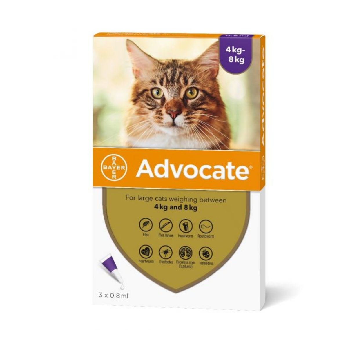 ADVOCATE spot-on za mačke 4–8 kg je veterinarsko-medicinski proizvod u obliku tečnosti za nakapavanje na kožu, sa kombinacijom imidakloprida i oksidektina. Namenjen je zaštiti mačaka od spoljašnjih i unutrašnjih parazita i koristi se kod infestacije buvama, ušnim šugarcima, kao i za suzbijanje određenih želudačno-crevnih oblika parazita. Takođe se primenjuje u prevenciji invazije srčanim crvom i kao podrška u kontroli alergijskog dermatitisa uzrokovanog buvama. Praktična spot-on primena omogućava jednostavno nanošenje direktno na kožu, u predelu vrata, čime se smanjuje mogućnost da mačka poliže preparat.