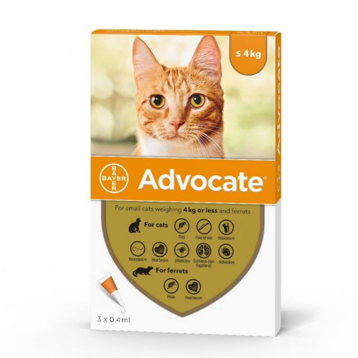 ADVOCATE spot-on za mačke do 4 kg je veterinarsko-medicinski proizvod u obliku tečnosti za nakapavanje na kožu, sa kombinacijom imidakloprida i moksidektina. Namenjen je zaštiti mačaka od spoljašnjih i unutrašnjih parazita i koristi se kod infestacije buvama, ušnim šugarcima, kao i za suzbijanje određenih želudačno-crevnih oblika parazita. Takođe se primenjuje u prevenciji invazije srčanim crvom i kao podrška u kontroli alergijskog dermatitisa uzrokovanog buvama. Spot-on primena omogućava jednostavno nanošenje direktno na kožu u predelu vrata, čime se smanjuje mogućnost da životinja poliže preparat.