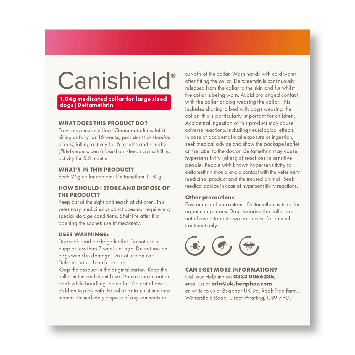 Beaphar Canishield® ogrlica za pse L predstavlja snažno i praktično rešenje za zaštitu od buva, krpelja i papatača, zahvaljujući aktivnoj supstanci deltametrin koja se postepeno oslobađa i obezbeđuje dugotrajan efekat.